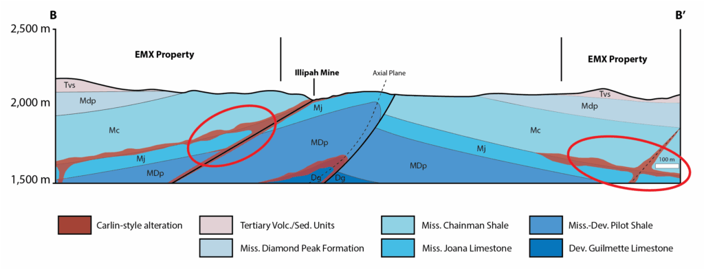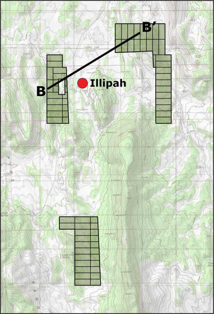 The Antelope project surrounds the historical Illipah Mine claim block. Elemental’s land position targets the along-strike extension of the anticline that hosts the historical Illipah Mine. The stratigraphic package on the property includes the Mississippian Chainman Shale, Joana Limestone, Pilot Shale, and the Devonian Guilmette Limestone, which comprise the host rocks at nearby past-producing Carlin-type mines (Alligator Ridge, Pan, Gold Rock, and Illipah). The Chainman-Joana and the Pilot-Guilmette contacts are known to be the most prolific host horizons regionally. The historically mined area at the Illipah deposit was below the Chainman-Joana contact, as the core of the anticline has been eroded. However, ENE-trending normal faults have downdropped this highly prospective contact to the north onto Elemental’s land position, where it is preserved. Where these ENE-trending faults intersect favorable stratigraphy or secondary structures on the Antelope Project, higher-grade gold mineralization is expected to occur.