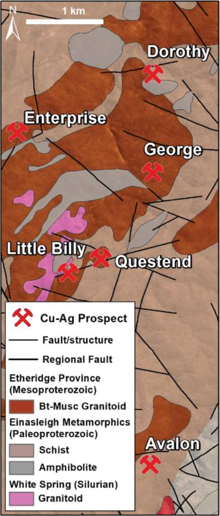 | Enterprise | Rock chip sample | 2.4 g/t Au, 0.3% Cu, & 0.1% Pb2 | Abandoned Cu prospect within Forsayth Granite | Au values never fully quantified |