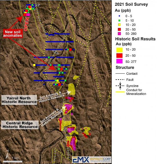Other gold-in-soil anomalies have been delineated immediately northwest of the historical Yarrol resources, along a contact zone between geological formations within folded and faulted sediments, which also merit follow-up exploration.